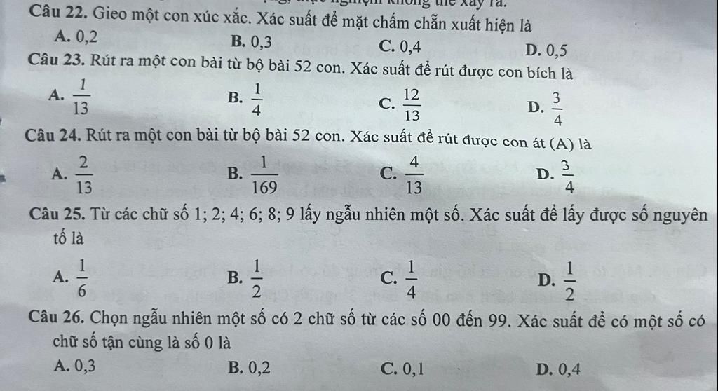 Xác suất được con A là : `4 : 52 = 1/13`