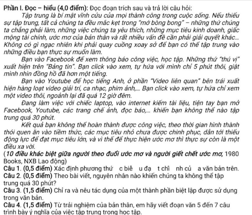 Câu 2. Nguyên nhân k thể tập trung quá 30p: đng lm vc với chiếc laptop, vào Internet kiếm tài liệu thì tiện tay mở Facebook, Youtube, các trang chế ảnh, đọc báo