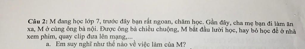 M đang được chiều chuộng quá mức, nên sinh ra suy nghĩ muốn gì cũng được. Vì vậy M mới sinh ra các hoạt động xấu trên. Vốn dĩ, M được chiều chuộng vì M ngoan, chăm học. Nhưng do ông bà M thương cháu ngoan, chăm học, nên mới làm chiều chuộng cháu.M cần chăm học lại như trước, nếu không sẽ làm ông bà và bố mẹ thất vọng. Kết quả học tập giảm sút và dễ sa đà vào con đường xấu