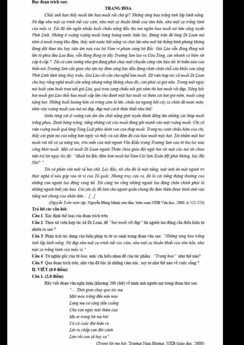 Qua đoạn trích trên, nhà văn thể hiện tình yêu, sự ngưỡng mộ, trân trọng những công sức vất vả của những người diêm dân. Đó là vẻ đẹp của người lao động chân chính, họ như những đóa hoa làm đẹp thêm cho quê hương, đất nước. Cũng từ đó, nhà thơ nhận ra rằng cuộc sống này những đóa hoa đẹp thực sự là những đóa hoa biết làm đẹp cho đời, biết cống hiến cho Tổ quốc.