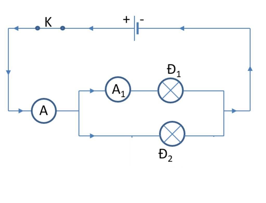 Giúp mình với: Cho mạch điện gồm: nguồn điện 1 pin, 1 khóa K đóng điều khiển chung toàn mạch, 1 ampe kế A đo cường độ dòng điện chạy trong mạch chính, 2 đèn $Đ_{1}$ và $Đ_{2}$ mắc song song với nhau, 1 ampe kế $A_{1}$ đo cường độ dòng điện của $Đ_{1}$ .