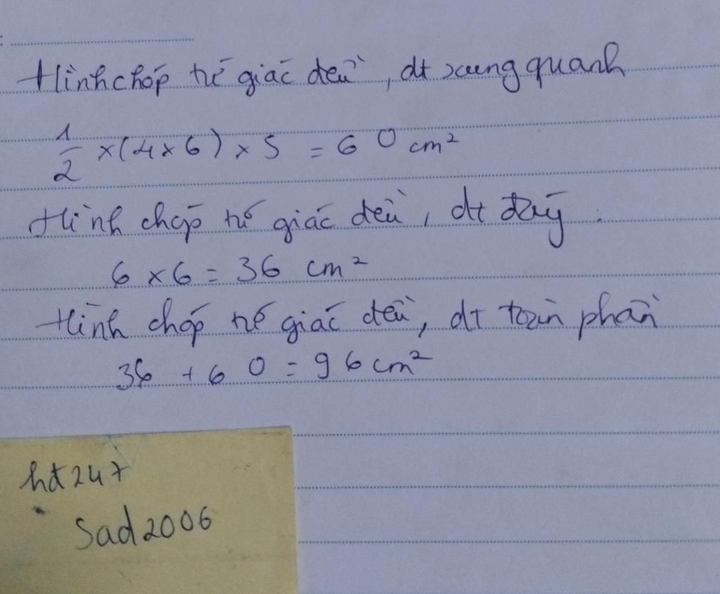 Vậy: Diện tích toàn phần hình chóp tứ giác đều là `96cm^2.`