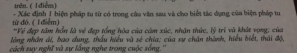 - 1 biện pháp tu từ: liệt kê : của cảm xúc, nhận thức, lí trí và khát vọng; của lòng nhân ái, bao dung, thấu hiểu và sẻ chia; của sự chân thành, hiểu biết, thái độ, cách suy nghĩ và sự lắng nghe trong cuộc sống