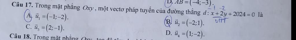 Vector pháp tuyến của $(d)$ là vector $\vec{n}=(1,2)$ và các vector song song song với $\vec{n}$