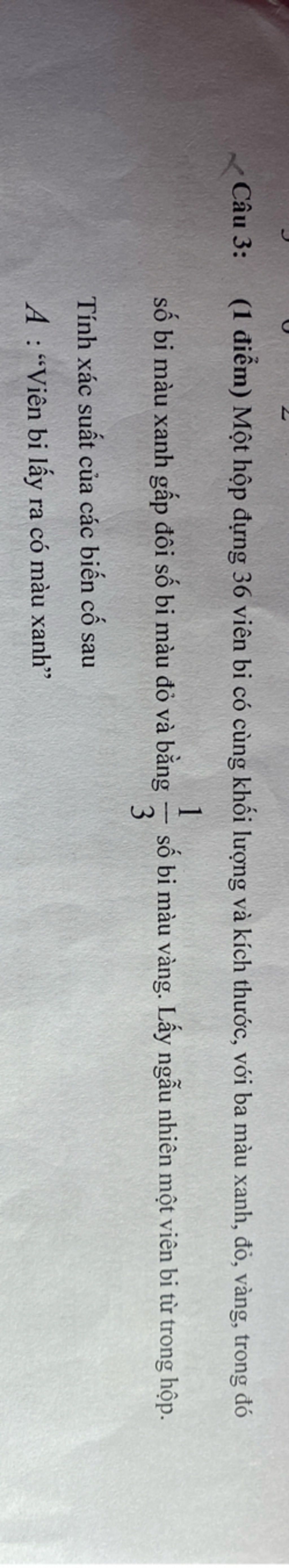 (1 điểm) Một hộp đựng 36 viên bi có cùng khối lượng và kích thước, với ba màu xanh, đỏ, vàng, trong đó