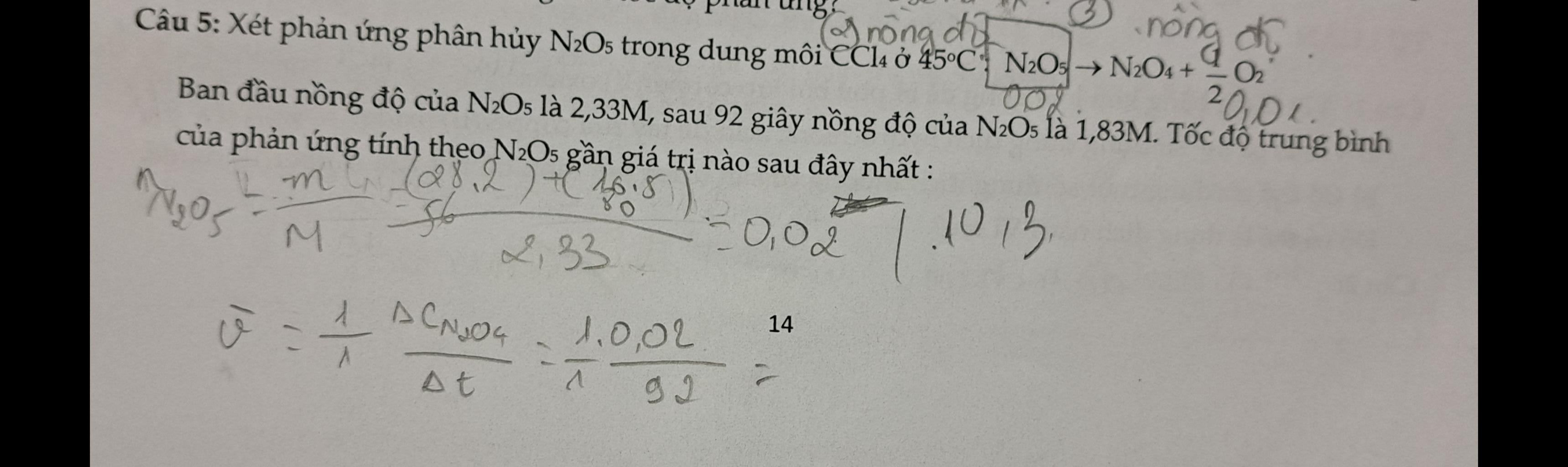 ${v}=\dfrac{-1}{1}\dfrac{\Delta C_{N_2O_5} }{\Delta t}=-\dfrac{1,83-2,33}{92}=5,43.10^{-3} M/s$