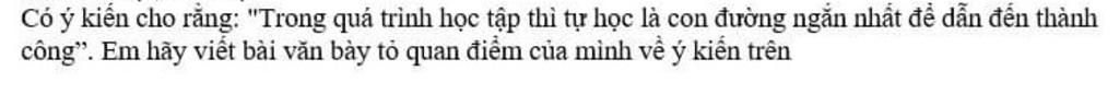 Có ý kiến cho rằng "Trong quá trình học tập, tự học là con đường ngắn nhất để dẫn đến thành công". Thật vậy, em hoàn toàn đồng tình với quan điểm này vì trong cuộc sống, học vấn là việc quan trọng mà mỗi người đều hướng tới. Sở dĩ nước Nhật và các nước Châu Âu phát triển vì người dân vô cùng coi trọng việc học. Trên thực tế, việc tự học là 1 phương pháp học mà mỗi bạn học sinh cần rèn luyện và trang bị mỗi ngày. Dù mỗi người có những phương thức học khác nhau nhưng việc tự học chính là cách học hữu hiệu và đem đến nhiều lợi ích nếu như con người muốn tạo được những bứt phá cho chính cuộc sống mình.