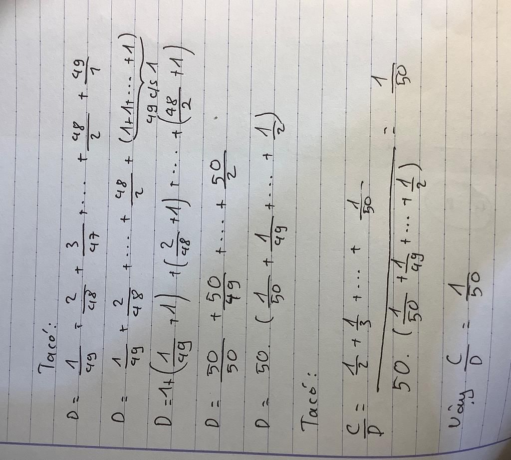 Hãy tính C/D. Biết C = 1/2+1/3+1/4+...+1/48+1/49+1/50 và D = 1/49+2/48+3/47+...+48/2+49/1