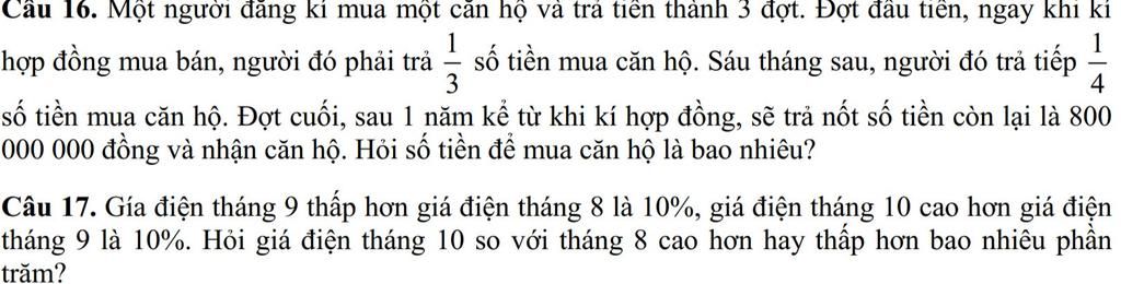Câu 16. Một người đăng kí mua một căn hộ và trả tiên thành 3 đợt. Đợt đầu tiên, ngay khi kí