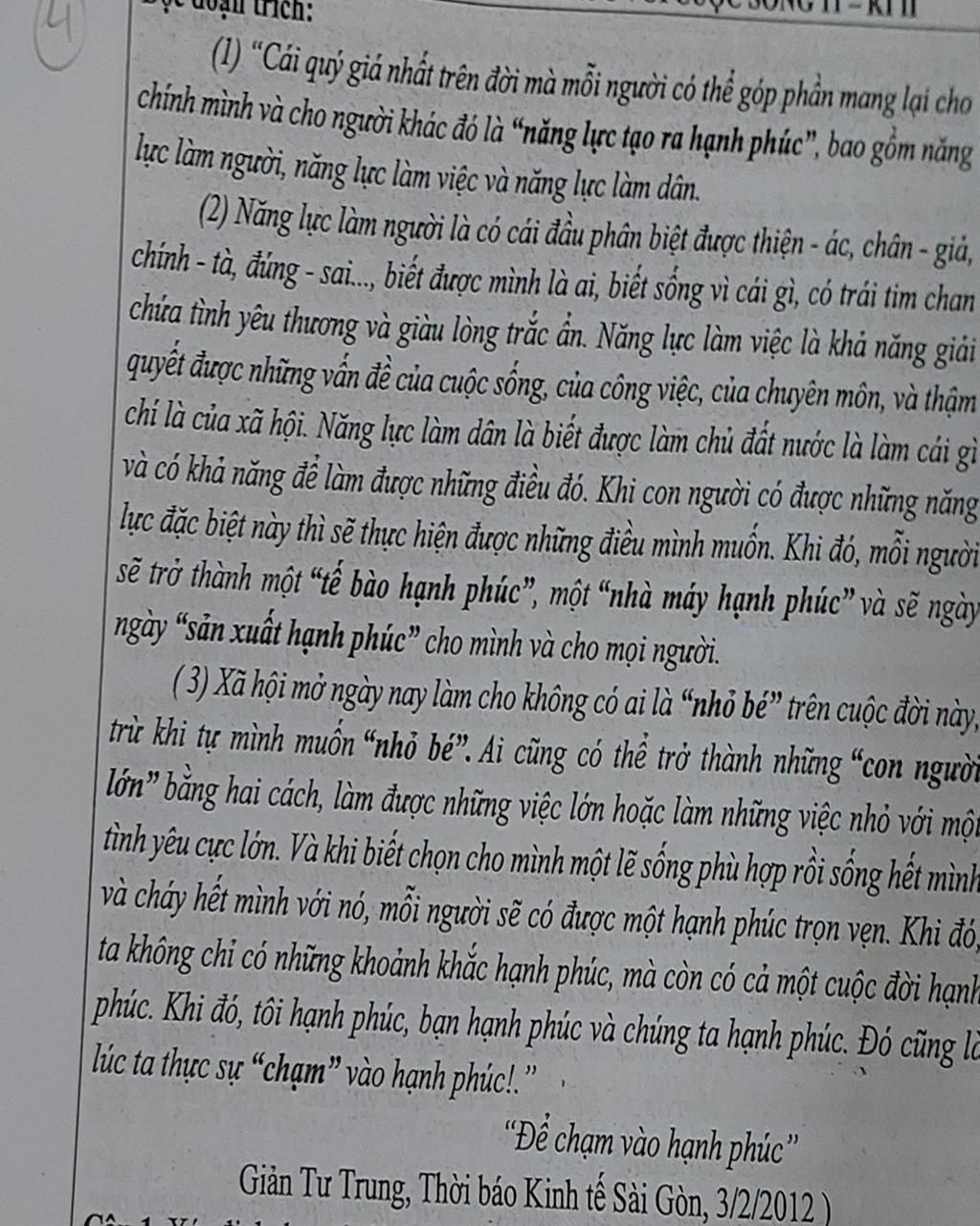 + Việc liệt kê các thành phần cụ thể của năng lực như "năng lực làm người", "năng lực làm việc", "năng lực làm dân" giúp cho người đọc hiểu rõ hơn về ý nghĩa và cách thức thực hiện năng lực này. Đồng thời, việc liệt kê các cách để trở thành "tế bào hạnh phúc", "nhà máy hạnh phúc" và "sản xuất hạnh phúc" cũng giúp tác giả nhấn mạnh ý chứng minh cho quan điểm của mình.