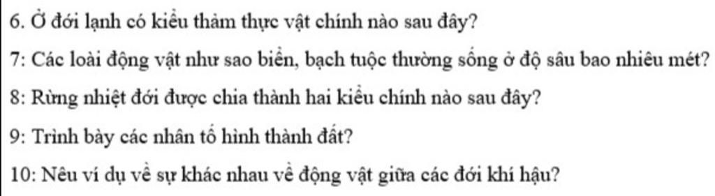 - hàn đới : động vật kém phong phú chủ yếu là những đv có lông dày đbao độ ấm