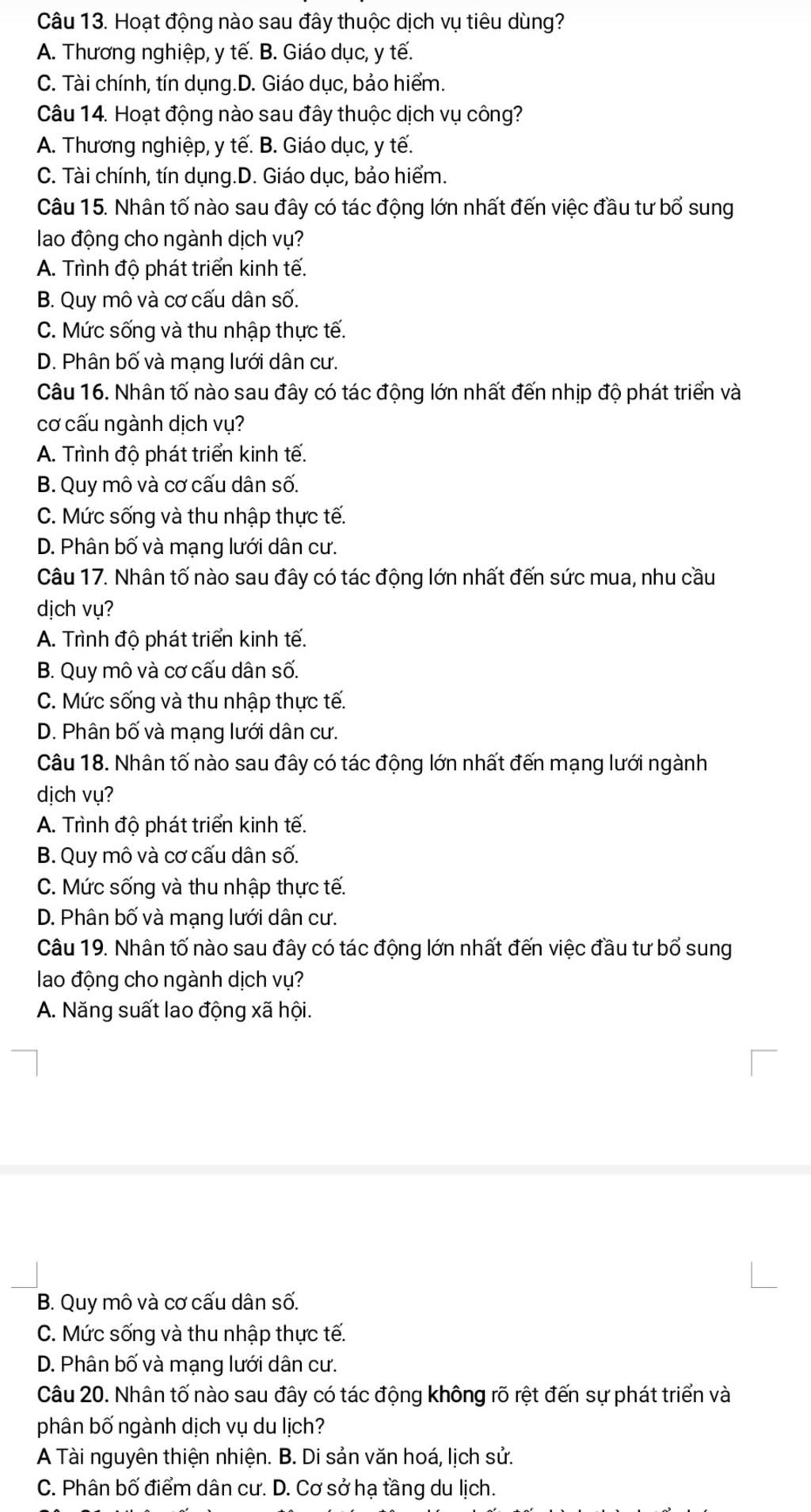 Câu 20. Nhân tố nào sau đây có tác động không rõ rệt đến sự phát triển và phân bố ngành dịch vụ