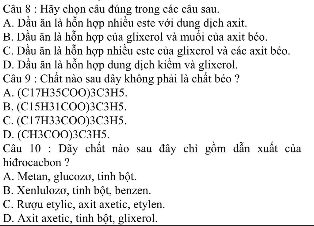 Dầu ăn (chất béo) là hỗn hợp nhiều este của glixerol với các axit béo.