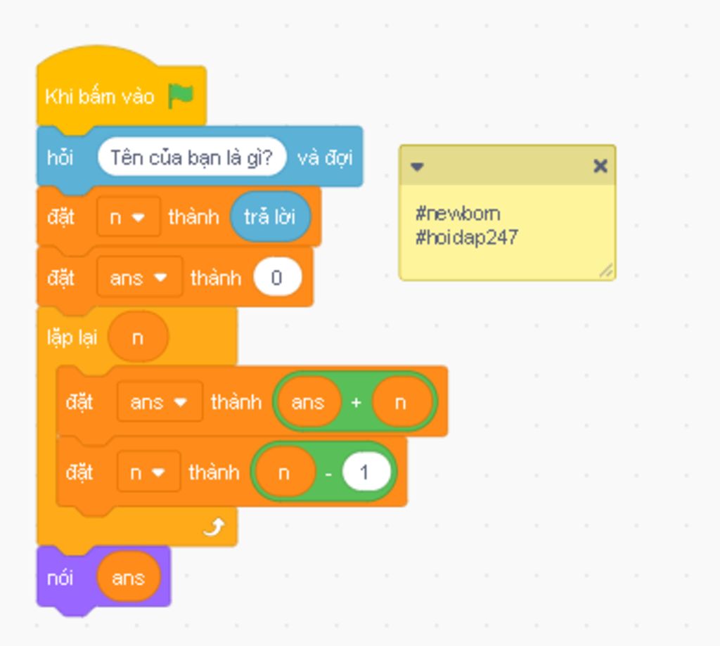 Sử dụng ngôn ngữ lập trình Scratch. Em viết chương trình nhập từ bàn phím số tự nhiên n, sau đó tính và thông báo tổng 1 + 2 + 3 + ... + n.