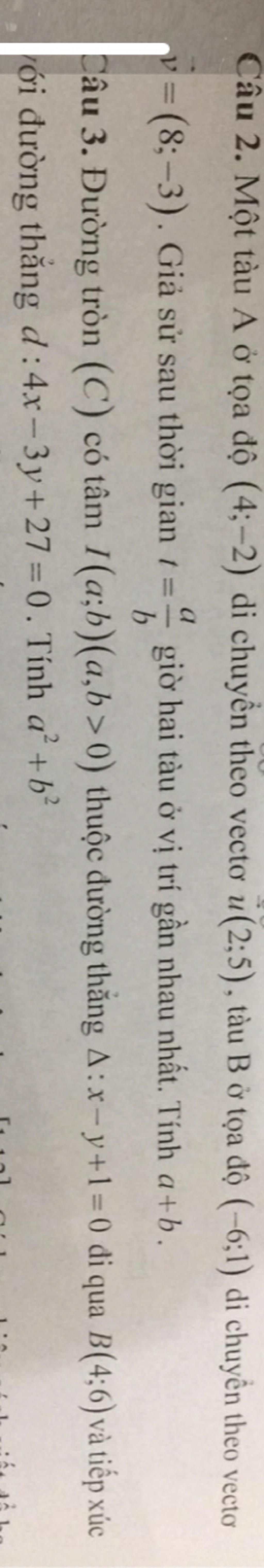 Câu 2. Một tàu A ở tọa độ (4;−2) di chuyển theo vectơ u(2;5), tàu B ở tọa độ (–6;1) di chuyển theo vectơ