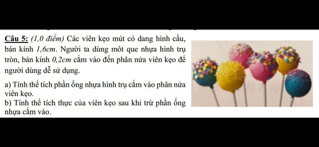 b/ Thể tích viên kẹo khi chưa cắm ổng nhựa: $V_{kẹo_1}$ =$\frac{4}{3}$ $\pi$ *1,6³=17,16cm³