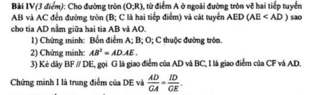 Bài IV(3 điểm): Cho đường tròn (O;R), từ điểm A ở ngoài đường tròn vẽ hai tiếp tuyến