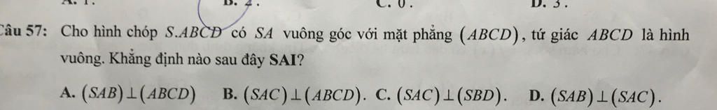 Câu 57: Cho hình chóp S.ABCĐ có SA vuông góc với mặt phẳng (ABCD), tứ giác ABCD là hình