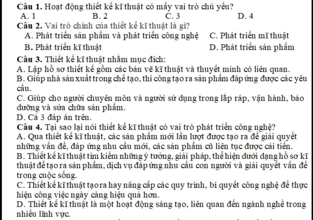 Câu 2. Vai trò của thiết kế kĩ thuật là phát triển sản phẩm và phát triển công nghệ.