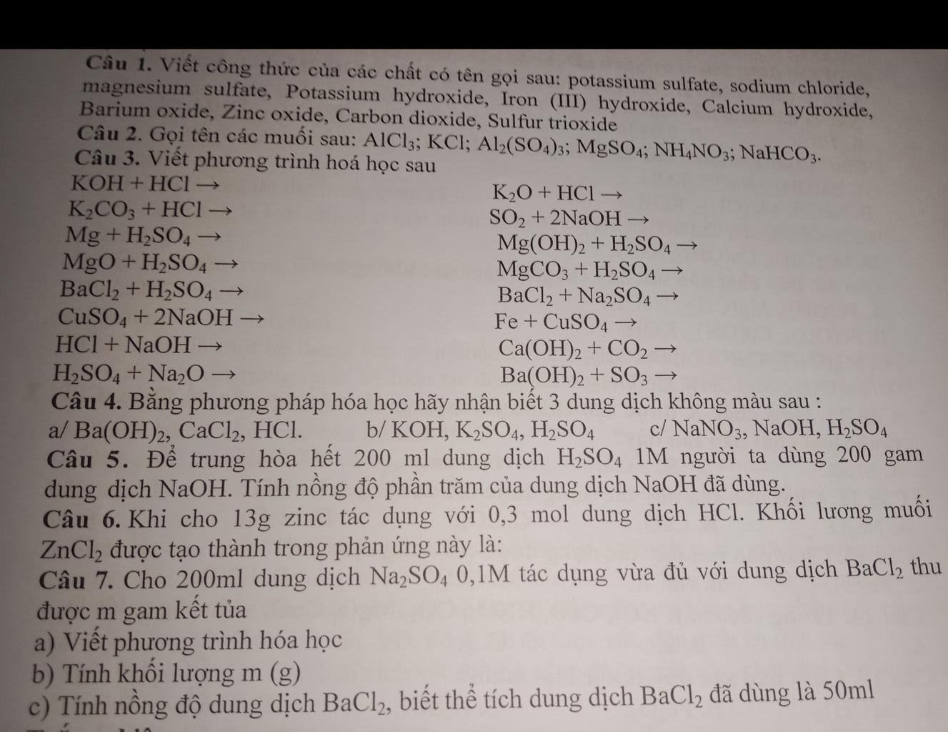 Câu 1. Viết công thức của các chất có tên gọi sau: potassium sulfate, sodium chloride,