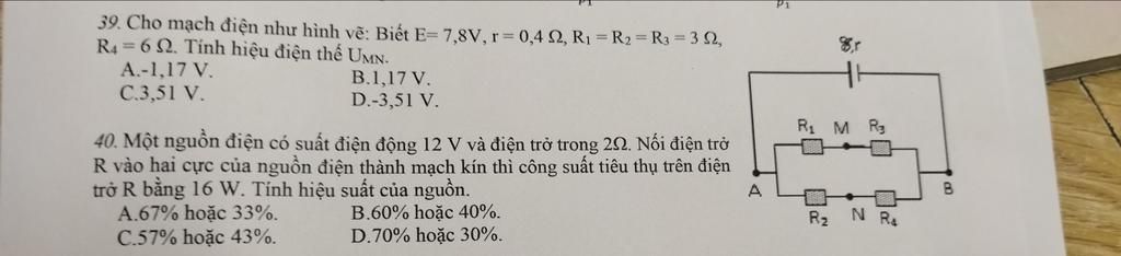 {U_{MN}} = - {U_1} + {U_2} = - 5,85 + 2,34 = - 3,51V