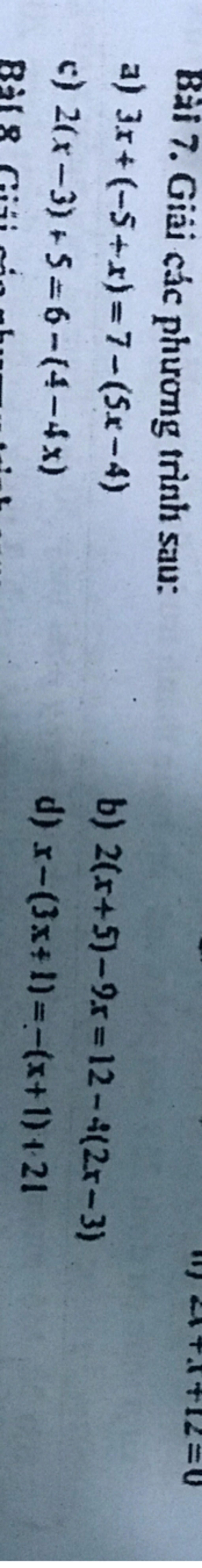 `a)3x+(-5+x)=7-(5x-4)`