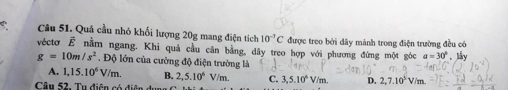 E = \dfrac{F}{q} = \dfrac{{\dfrac{{\sqrt 3 }}{{15}}}}{{{{10}^{ - 7}}}} = 1,{15.10^6}\left( {V/m} \right)