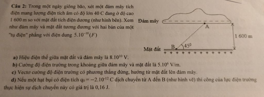 c) Véc tơ cường độ điện trường có phương thẳng đứng, hướng từ mặt đất lên đám mây.