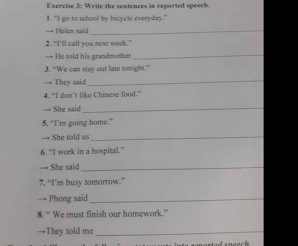 1. Helen said that she went to school by bicycle every day.
