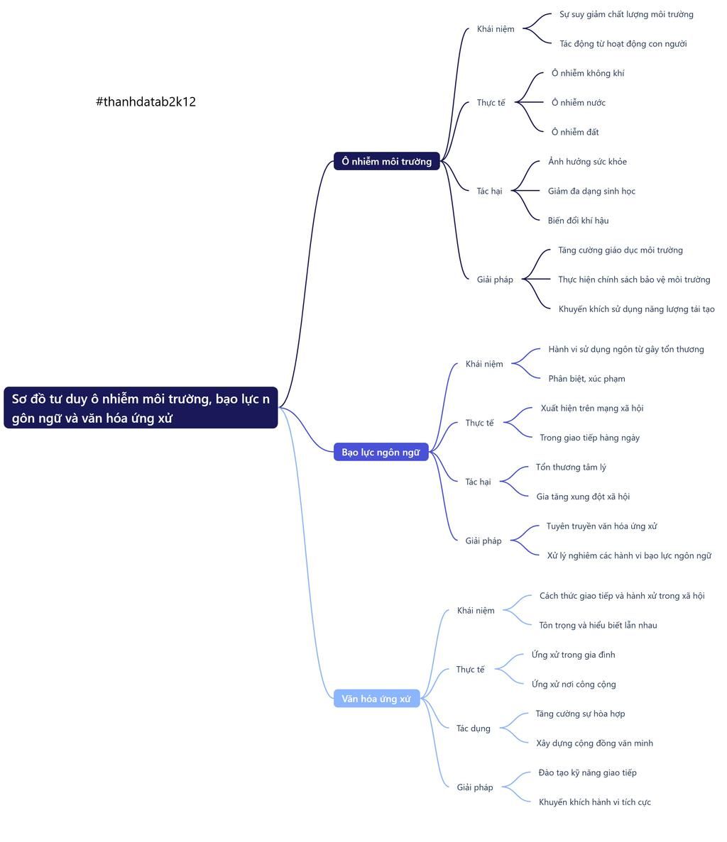 Sơ đồ tư duy ô nhiễm môi trường ,bạo lực ngôn ngữ và văn hóa ứng xử phải có đầy đủ khái niệm thực, tế tác hại/ tác dụng, giải pháp