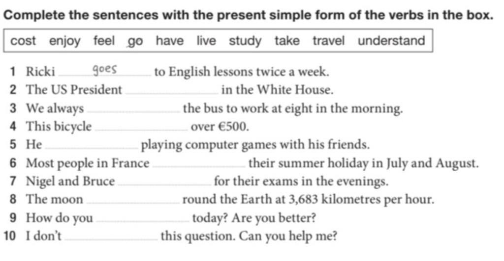 1 goes 2 lives 3 take 4 costs 5 enjoys 6 have 7 study 8 travels 9 feel 10 understand