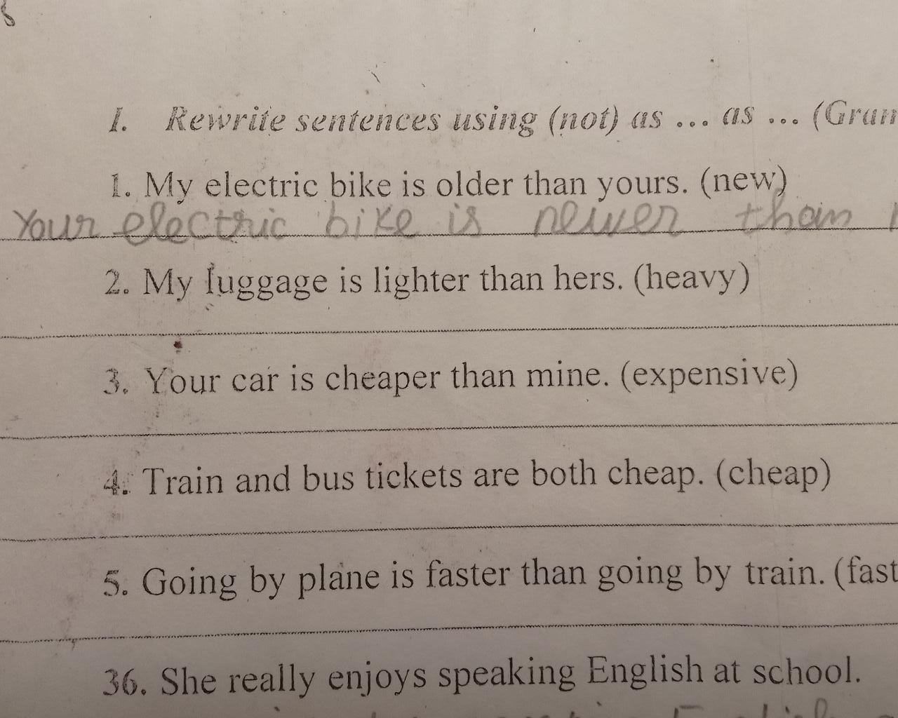 My luggage is lighter than hers (hearvy) Your car is cheaper than mine (expensive)