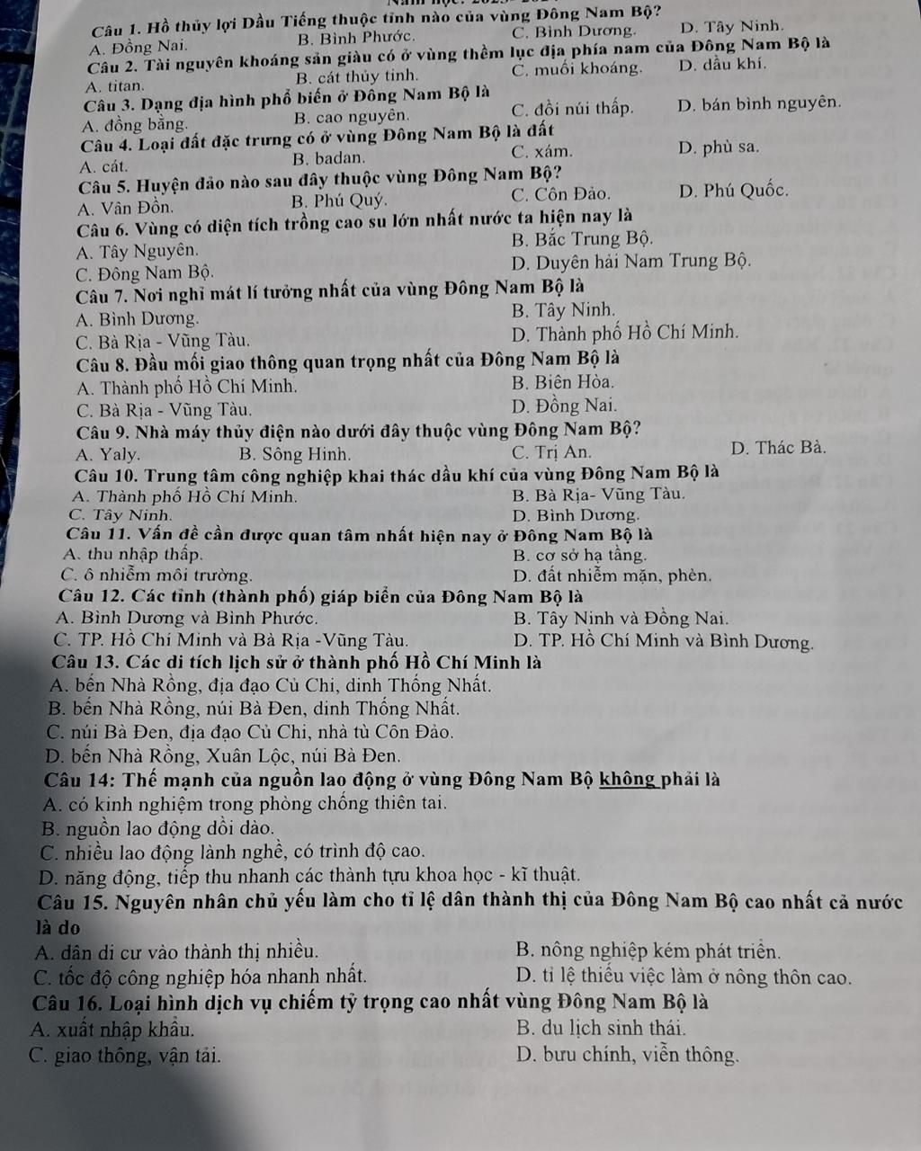 Câu 1. Hồ thủy lợi Dầu Tiếng thuộc tỉnh nào của vùng Đông Nam Bộ?