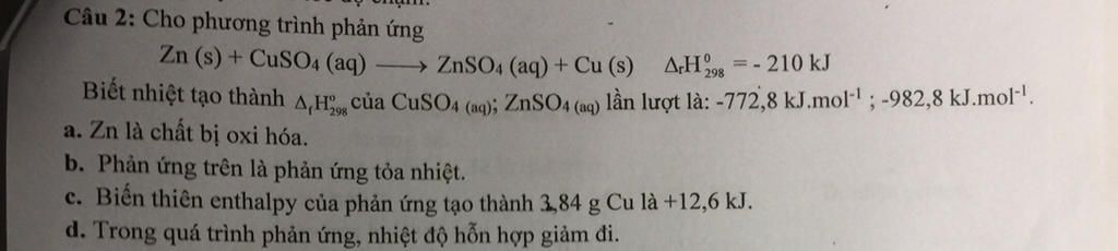 d, Sai. Nhiệt độ hỗn hợp (bao gồm cả dung môi và chất phản ứng) tăng lên vì nhiệt toả ra từ phản ứng làm nóng dung môi nên ta thấy nhiệt độ cốc/ống nghiệm/... chứa hệ phản ứng tăng lên.
