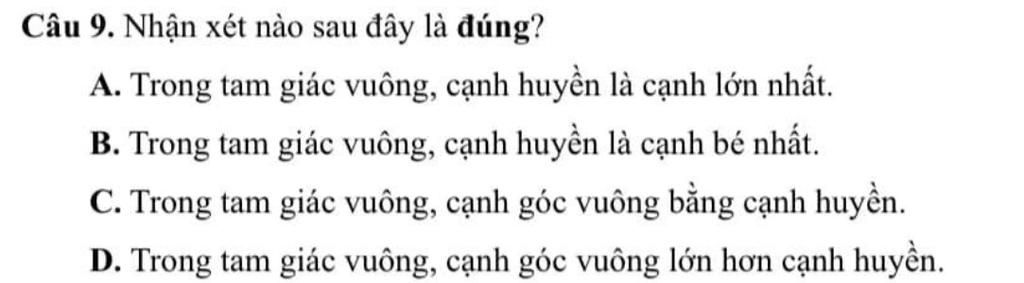 D. Trong tam giác vuông, cạnh góc vuông lớn hơn cạnh huyền.
