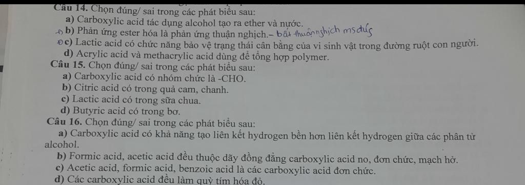 a, Sai. Sản phẩm của phản ứng giữa carboxylic acid và alcohol gọi là ester, không phải ether.