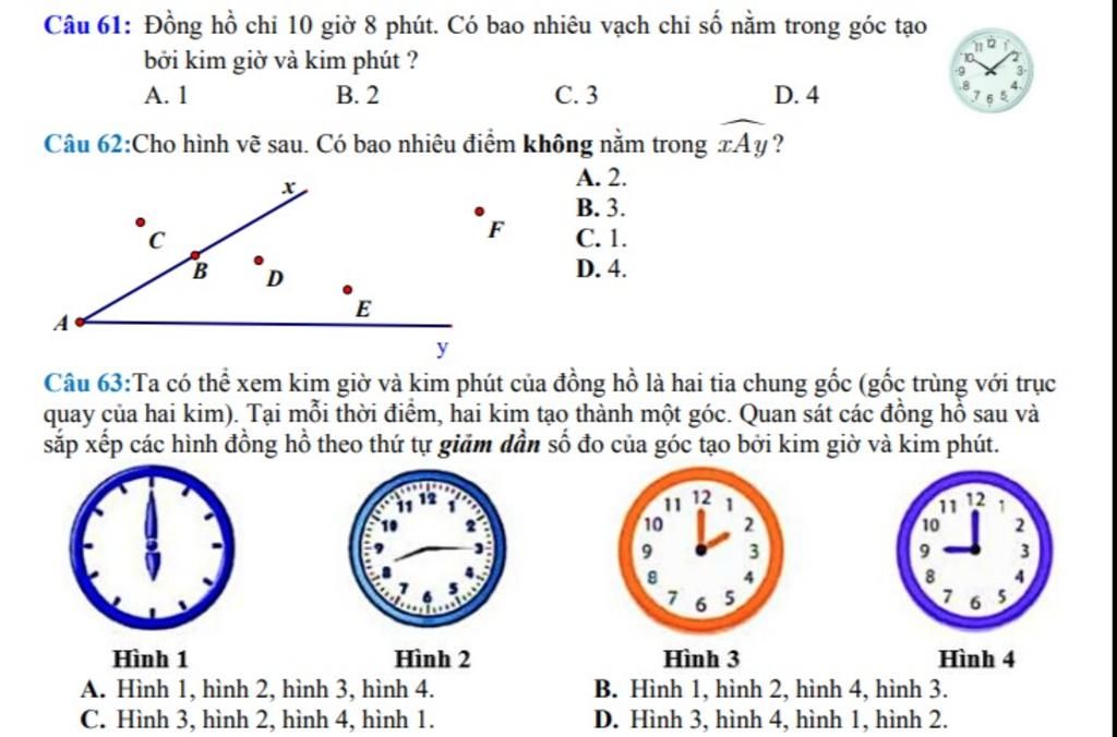Câu 61: Đồng hồ chỉ 10 giờ 8 phút. Có bao nhiêu vạch chỉ số nằm trong góc tạo