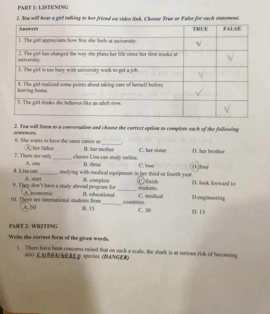1. You will hear a girl talking to her friend on video link. Choose True or False for each statement.