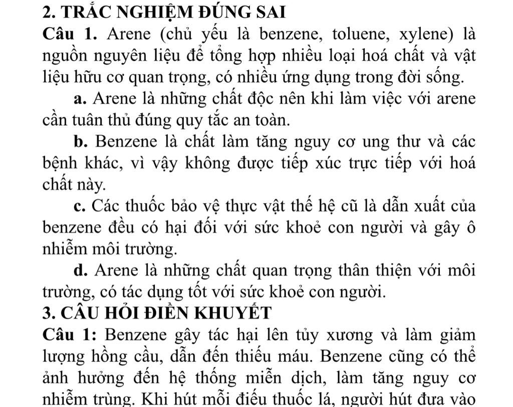 a: Đúng. Arene, đặc biệt là benzene, toluene và xylene, đều là những chất độc hại có thể ảnh hưởng đến sức khỏe con người theo nhiều cách khác nhau, bao gồm:
