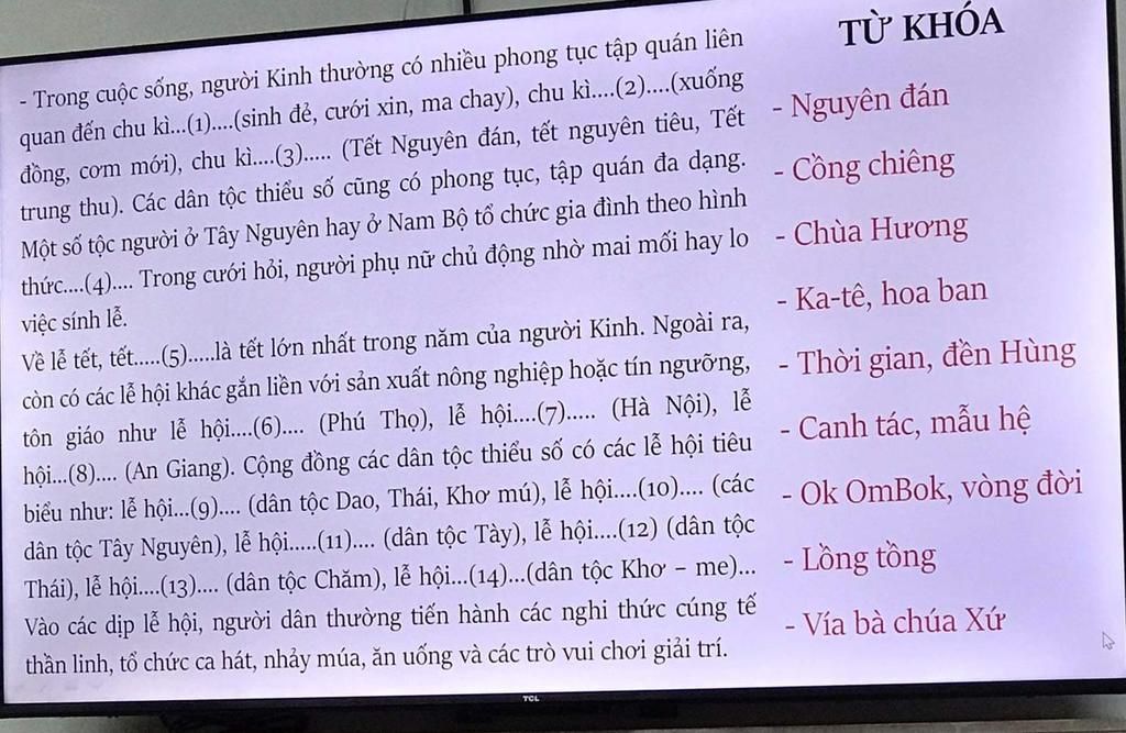 tôn giáo như lễ hội Đền Hùng (Phú Thọ), lễ hội Chùa Hương (Hà Nội), lễ hội vía bà Chúa xứ (An Giang). Cộng đồng các dân tộc thiểu số có các lễ hội tiêu biểu như: lễ hội (dân tộc Dao, Thái, Khơ mú), lễ hội cồng chiêng (các dân tộc Tây Nguyên), lễ hội lồng tồng (dân tộc Tày), lễ hội hoa ban (dân tộc Thái), lễ hội Ka -tê (dân tộc Chăm), lễ hội Ok Om Bok (dân tộc Khơ - me)...