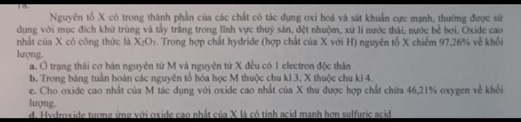d, Đúng. $HClO_4$ có tính acid mạnh hơn $H_2SO_4$ vì $S, Cl$ cùng thuộc chu kì $3$ nhưng $Cl$ ở nhóm $A$ lớn hơn.
