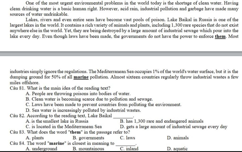 `-` DC: One of the most urgent environmental problems... is the shortage of clean water `->` nói về nguyên nhân làm nước sách