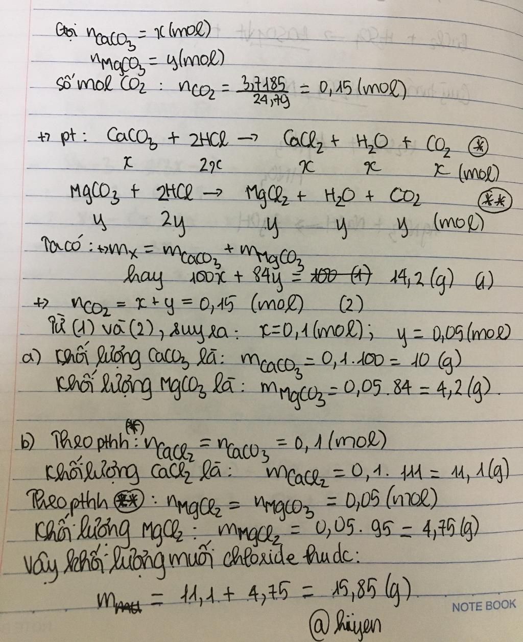Câu 27: Cho 14,2 g hỗn hợp X gổm CaCO3 và MgCO3 tác dụng với dung dịch HCI dư, thu được 3,7185 lít khí CO2 (ở 25°c, 1 bar).