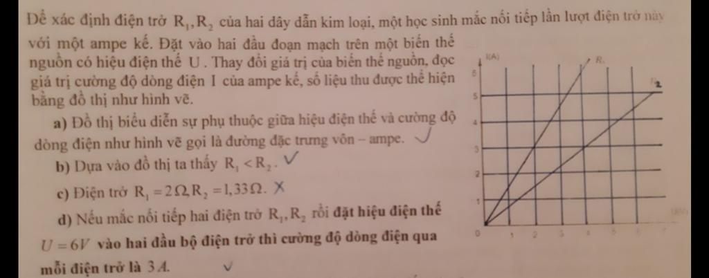 Đồ thị ứng với `R_1` đi qua điểm có hiệu điện thế `U = 2 (V), I = 3 (A)`