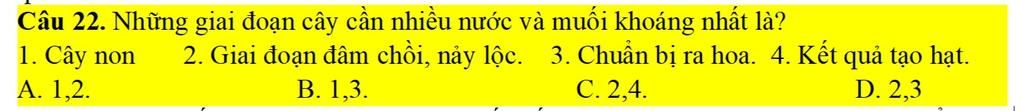 Câu `22:` Những giai đoạn cây cần nhiều nước và muối khoáng nhất`:`