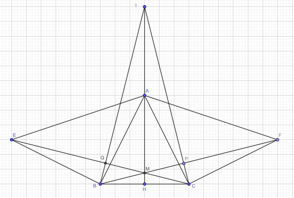 cho tan giác abc cân tại a có ba góc đều là góc nhọn về phía ngoài của tam giác abc vẽ các tam giác vuông cân abe vuông cân tại b acf vuông cân c kẻ đường cao ah trên tia đối của tia ah lấy điểm i sao cho ai=bc cm.