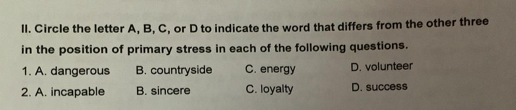 II. Circle the letter A, B, C, or D to indicate the word that differs from the other three