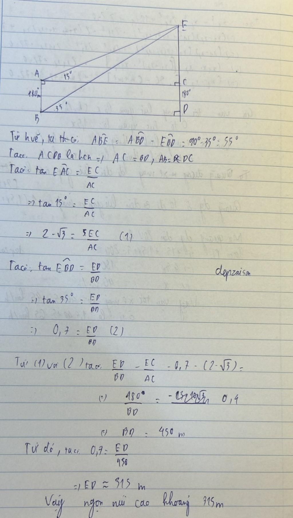 Để đo chiều cao của một ngọn núi, người quan sát đứng từ hai vị trí khác nhau của tòa nhà. Lần thứ nhất người đó quan sát đỉnh núi từ trên sân thượng với phương nhìn tạo với phương nằm ngang góc 15 độ và lần thứ hai người này quan sát đỉnh núi từ mặt sàn tầng trệt của cùng tòa nhà đó với phương nhìn tạo với phương nằm ngang góc 35 độ (như hình vẽ bên). Tính chiều cao của ngọn núi biết rằng khoảng cách từ mặt sàn tầng trệt đến sân thường là 180 mét (kết quả làm tròn đến chữ số thập thứ nhất)