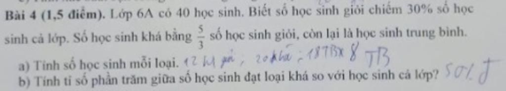 `b.` Tỉ số phần trăm số học sinh đạt loại khá so với số học sinh cả lớp là `50%.`