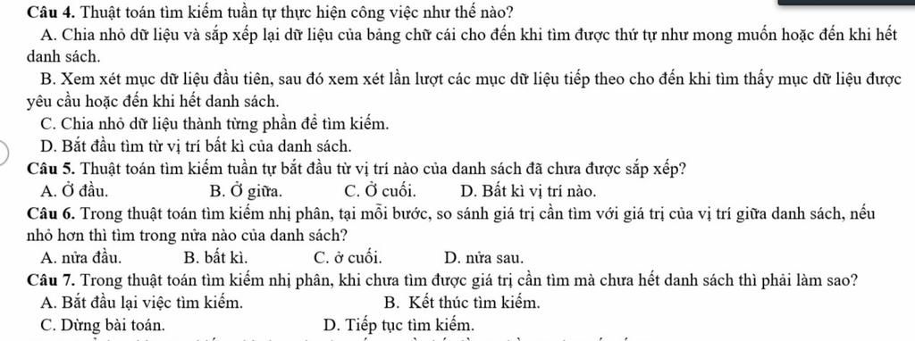 Câu 4. Thuật toán tìm kiếm tuần tự thực hiện công việc như thế nào?